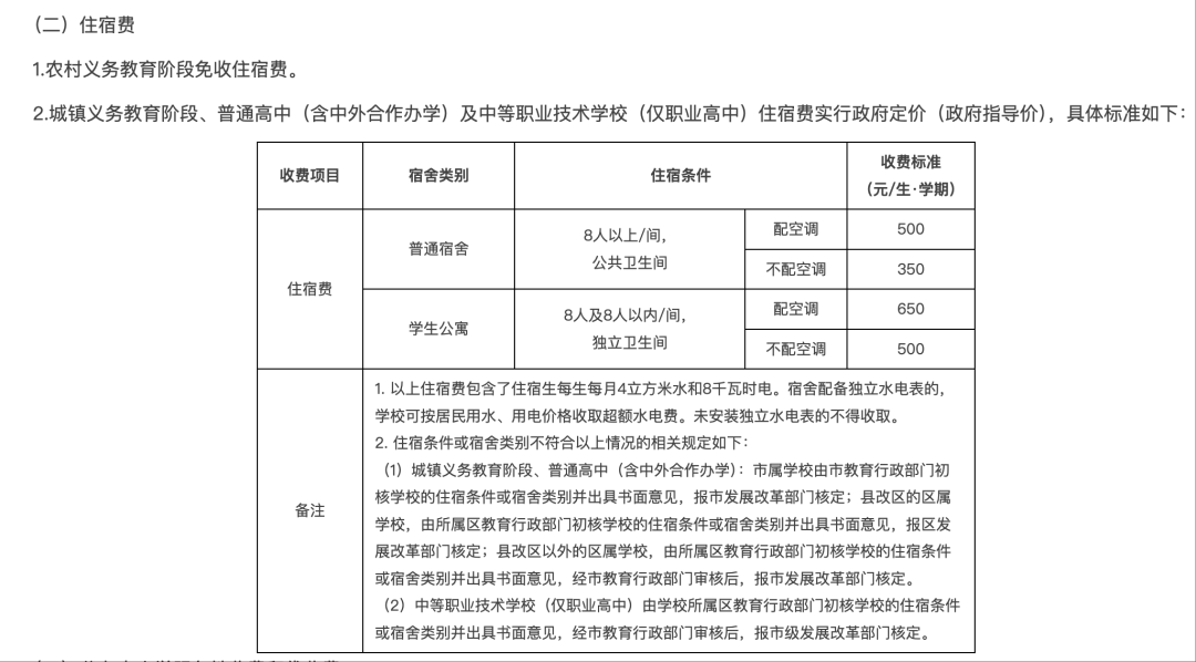 城镇义务教育阶段、普通高中(含中外合作办学)及中等职业技术学校(仅职业高中)住宿费实行政府定价(政府指导价),具体标准如下: