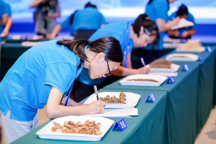 在中药材鉴定竞赛项目实操考核现场,记者看到十几张桌子的桌面上摆放了80种中药材,有动物类、有植物类,还有中药饮片以及中药粉末。参赛选手按照序号依次排开,同时进行鉴定。在每个中药材面前,选手可以停留53秒,通过观看、闻气味、摸质感以及品尝等方式进行鉴定并即时书写答案。时间一到,选手们必须立刻按照现场指令统一移动到下一个中药材面前,如此重复80次。