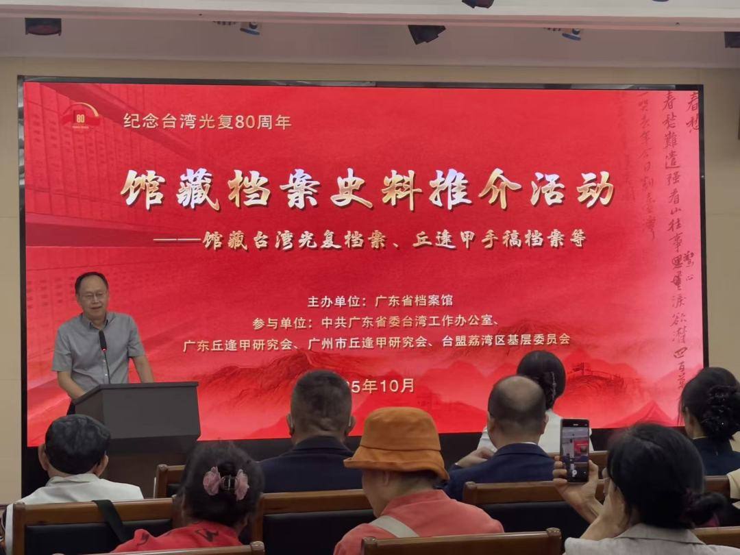 10月25日是台湾光复80周年纪念日。21日,广东省档案馆和广东省海峡两岸交流促进会、广东丘逢甲研究会、广州市丘逢甲研究会、台盟荔湾区基层委员会、蕉岭县丘逢甲陈列馆等单位,共同举办丘逢甲档案史料及台湾光复档案推介活动。