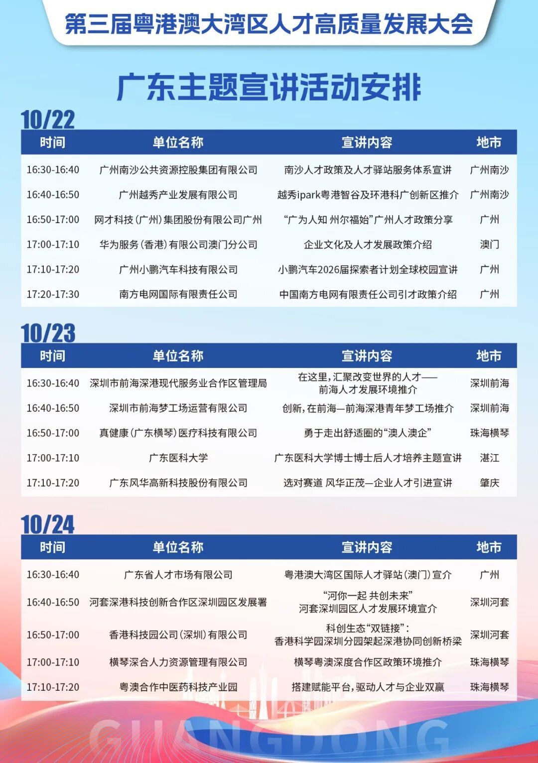 广东同步配套“1+1+3”活动,“好戏”连台,10月22至24日下午,在澳门威尼斯人金光会展那不勒斯厅“粤聚英才 粤见未来”广东省主题宣讲活动现场开讲,四大平台、创业园区、国际人才驿站、广东名企共邀人才在粤发展。