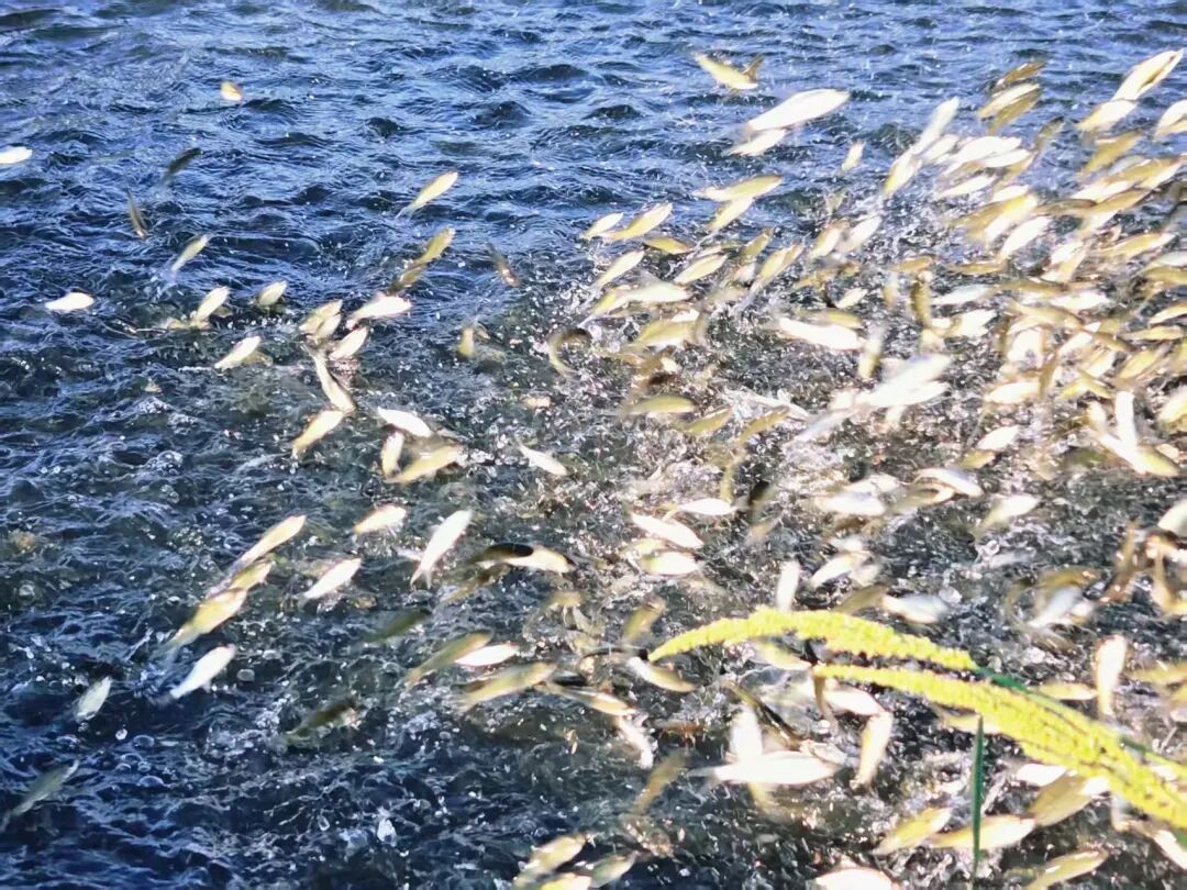 撒网、捕捞、收网……只见七八名身着连体胶皮裤的刮鱼工正拉着一张大网,有的站在岸边,有的蹚进水中,大家默契配合,不停地拉动手中的渔网。随着渔网慢慢收紧,水面沸腾起来,浪花飞溅,无数尾小鲮鱼苗在渔网中打滚、撒欢,不断跳跃出水面。