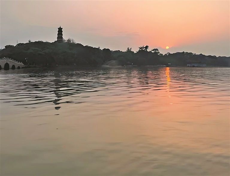 夕阳西下,惠州西湖披满霞光,六个湖宛如六块翡翠镶嵌在东江南岸、西枝江西侧的群山之间,远处泗洲塔、苏堤、陈公堤若隐若现,与城市高楼大厦、市井烟火融为一体,构成了“半城山色半城湖”的绝妙景观。