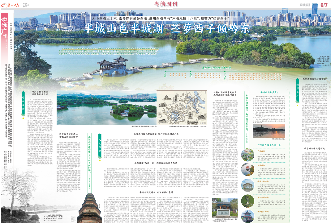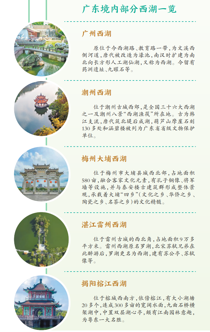 天下西湖三十六。西湖是自然与人文“天人合一”的典范。在南粤,广州西湖、惠州西湖、潮州西湖,雷州西湖、梅州大埔西湖、江门恩平西湖、茂名电白西湖、阳江西湖、揭阳榕江西湖……留下诸多西湖印记。其中惠州西湖宛如碧玉镶嵌于岭南东江畔,被誉为“苎萝西子”,缔造出惠州“半城山色半城湖”的城市底色。众多文化名人在此留下厚重的人文历史,惠州西湖成为人们“不辞长作岭南人”的“桃花源”。