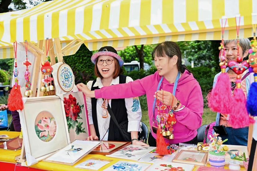 本次开放日也是学员社团学习成果的一次集中展示。在手工艺作品展示区,手工班级的学员们带来了他们精心制作的剪纸、串珠、藤条编织、宝石绕绳、广绣、衍纸等作品。一件件构思巧妙、制作精美的手工艺品,凝聚了学员们的心血与智慧,引得参观者连连称赞,纷纷询问制作技巧。“现场这些展示的刺绣作品,都是老师们手把手教我们的。我们一个学期会绣一到两个作品,能学一门手工艺,我们感到很有收获感。”广绣社团学员现场向记者介绍道,“这里的老师非常棒,我们在学习过程中也丰富了自己的退休生活,而且心态变得越来越年轻,精气神也越来越好。”