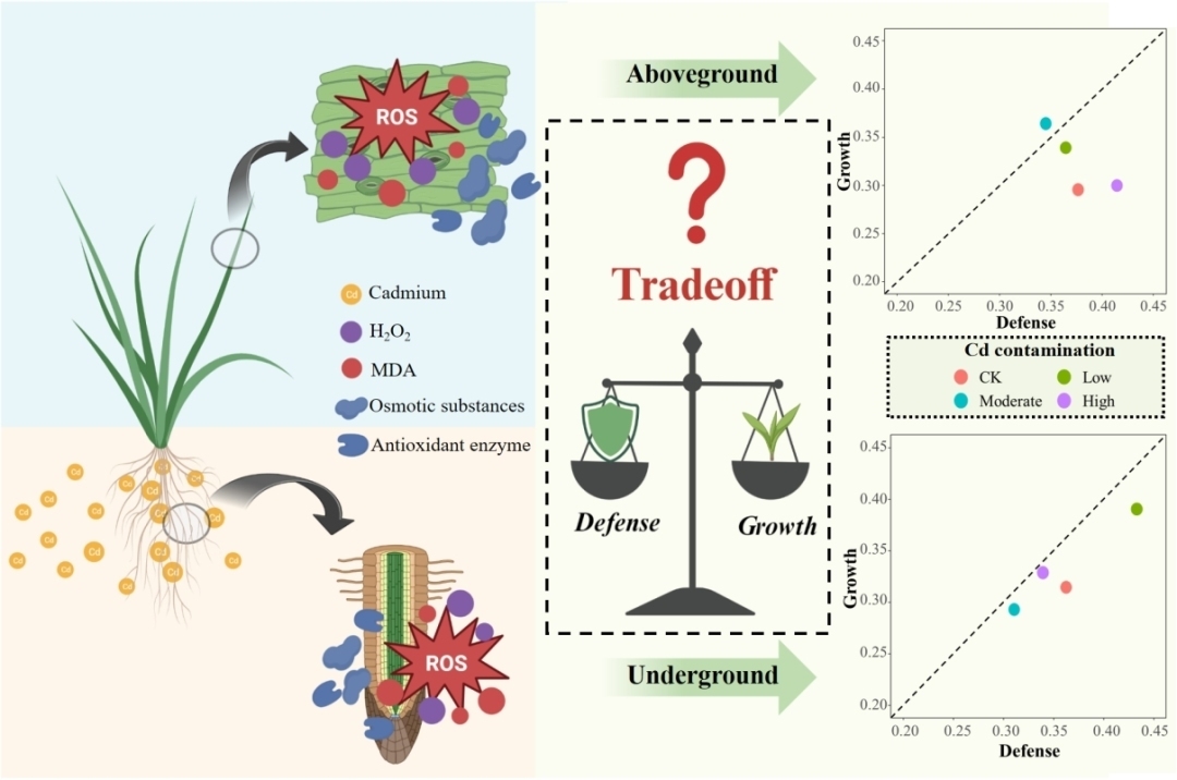 研究发现,在外源镉胁迫下,地上和地下部分的资源权衡模式表现不同;尤其在高浓度外源镉胁迫下,地上组织偏向生长,而地下部分则转向防御,显示出组织间资源分配策略的重塑;此外,五节芒地下部分的权衡主要受植物Cd积累的影响,而地上部分的权衡则主要受植物过氧化氢的积累驱动。