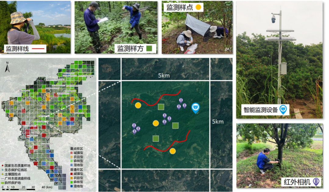 为了能全面把脉广州生态环境质量状况,在正式开展监测调查前,调查队伍首先要在国家生态质量样地监测网络的基础上,综合考虑广州市生态系统类型、动植物分布、自然保护地和生态保护红线等关键因素,进一步加密布设监测样地,构建覆盖更全面、更具代表性的广州市生物多样性监测网络,包括监测样区、监测样线、监测样方和监测点。