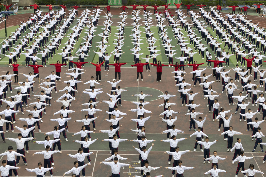 天河区盈彩美居小学的大课间中,同学们接连进行跑操、武术操、南拳、打跳舞等,在运动中舒展身姿、挥拳踢腿,动作整齐划一。该校学生每天有40分钟大课间、40分钟体育课、4个15分钟微课间,保证2小时的综合体育活动时间。