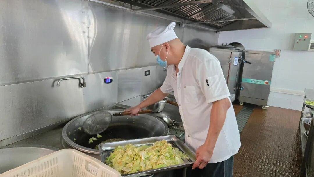 采访当天上午11时许,谢村海觉幼儿园的厨房里镬气十足,主厨何炽权正在烹饪最后一个菜。只见他先把大锅烧热,倒入热油,放入少量蒜头煸出香味,再倒入包菜不停翻炒。待包菜变得软熟后撒上盐调味,关火装盘。一大盆手撕包菜新鲜出炉,浓郁的香气瞬间弥漫开来。