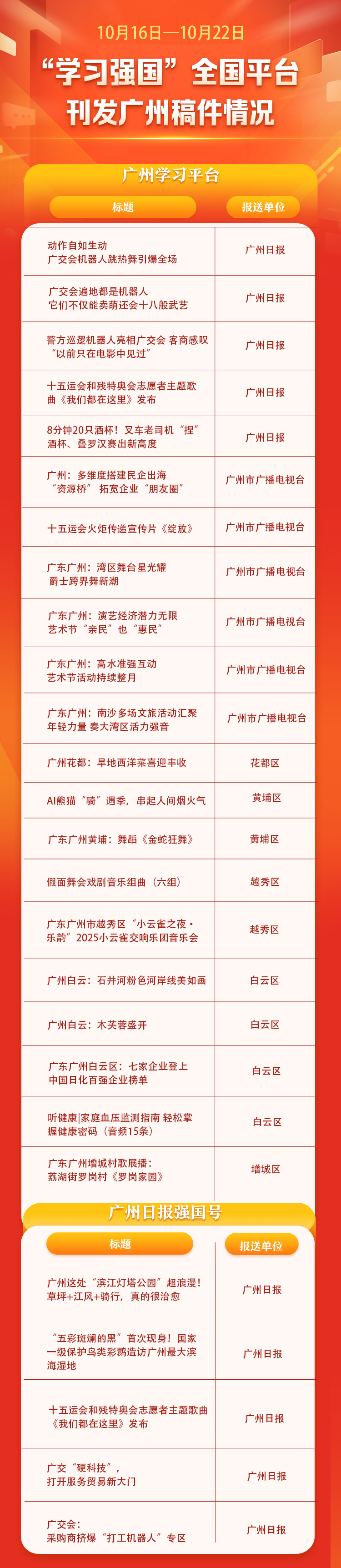 10月16日—10月22日“学习强国”全国平台刊发广州稿件情况