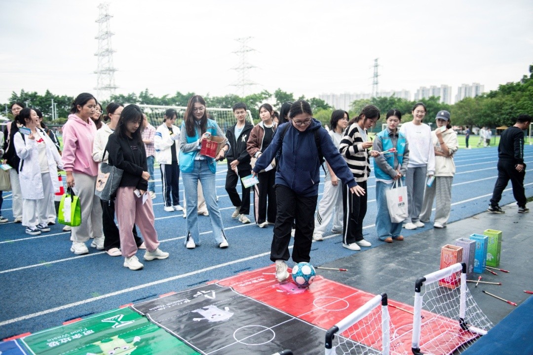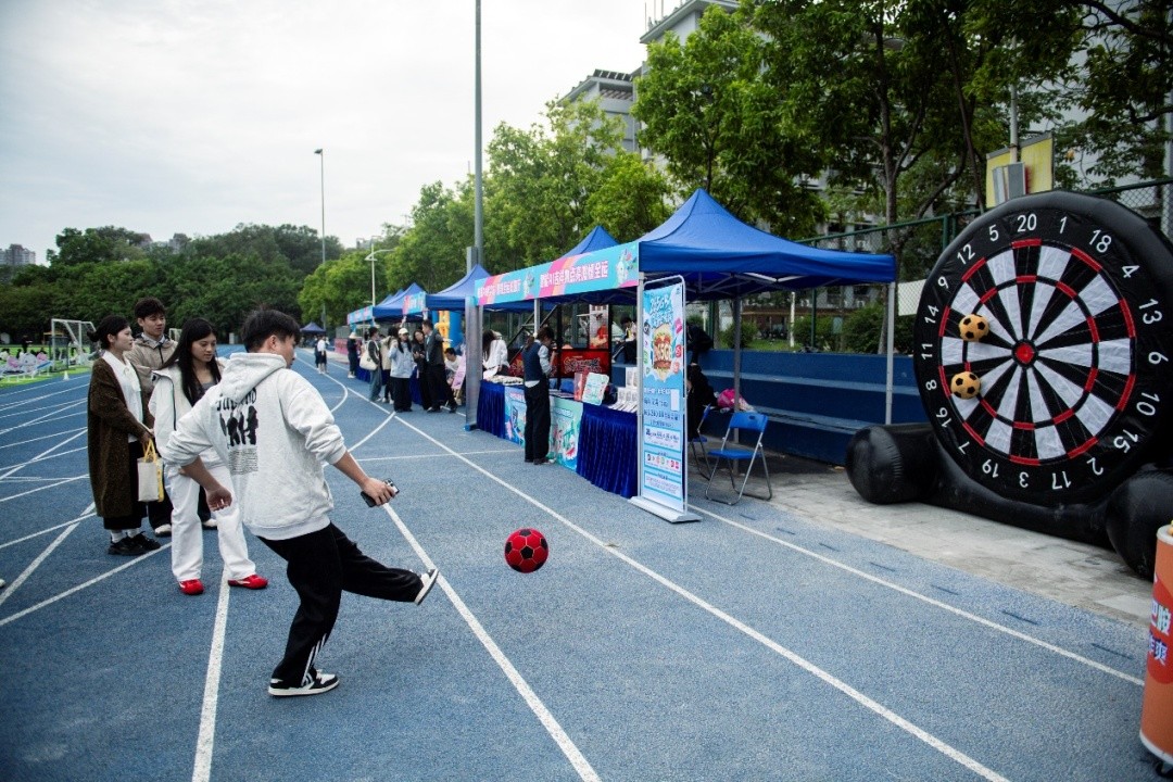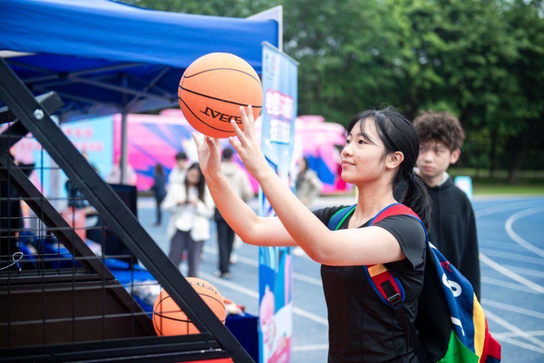 舞台的光芒之外,遍布场地的运动互动装置则让“参与感”成为每个人的真实体验。互动体验区热热闹非凡,互动摊位前排起了长龙,投篮竞技赛、趣味酷跑赛激战正酣,喝彩声,充气飞镖、飞盘九宫格等项目则成为同窗好友、师生协作“快乐战场”。