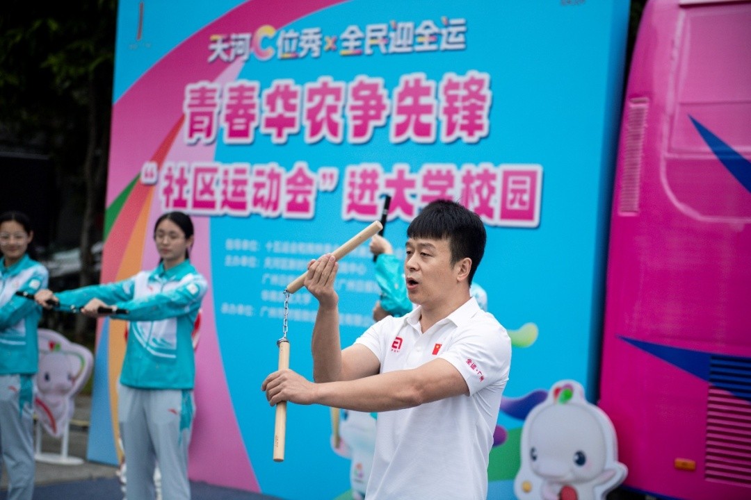全运主题巴士区人气爆棚,主舞台同样星光熠熠、高潮迭起!双节棍世界冠军吕一杰的登场瞬间点燃全场。光影之间,双节棍如银蛇狂舞,破风之声凌厉,赢得阵阵惊呼与掌声。表演结束后,吕一杰热情邀请同学参与即兴教学,舞台变成了一堂生动的“冠军大师课”。他分解教授握棍姿势与发力技巧,同学们从生涩模仿到逐渐掌握节奏,现场充满了鼓励的掌声和欢快的笑声,拼搏坚持的体育精神也悄然扎根。