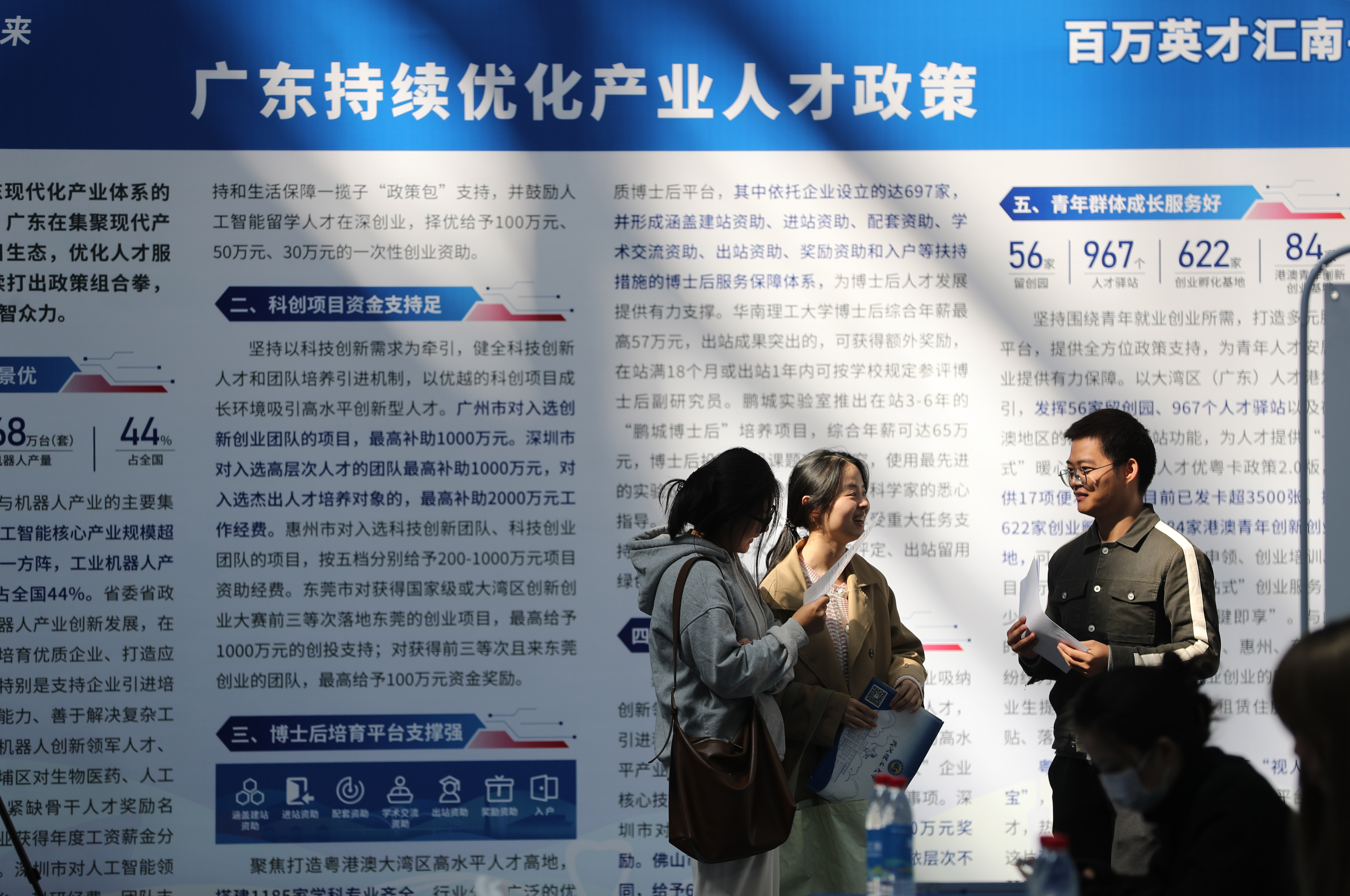 学生在广东省人才政策宣传栏前交流。