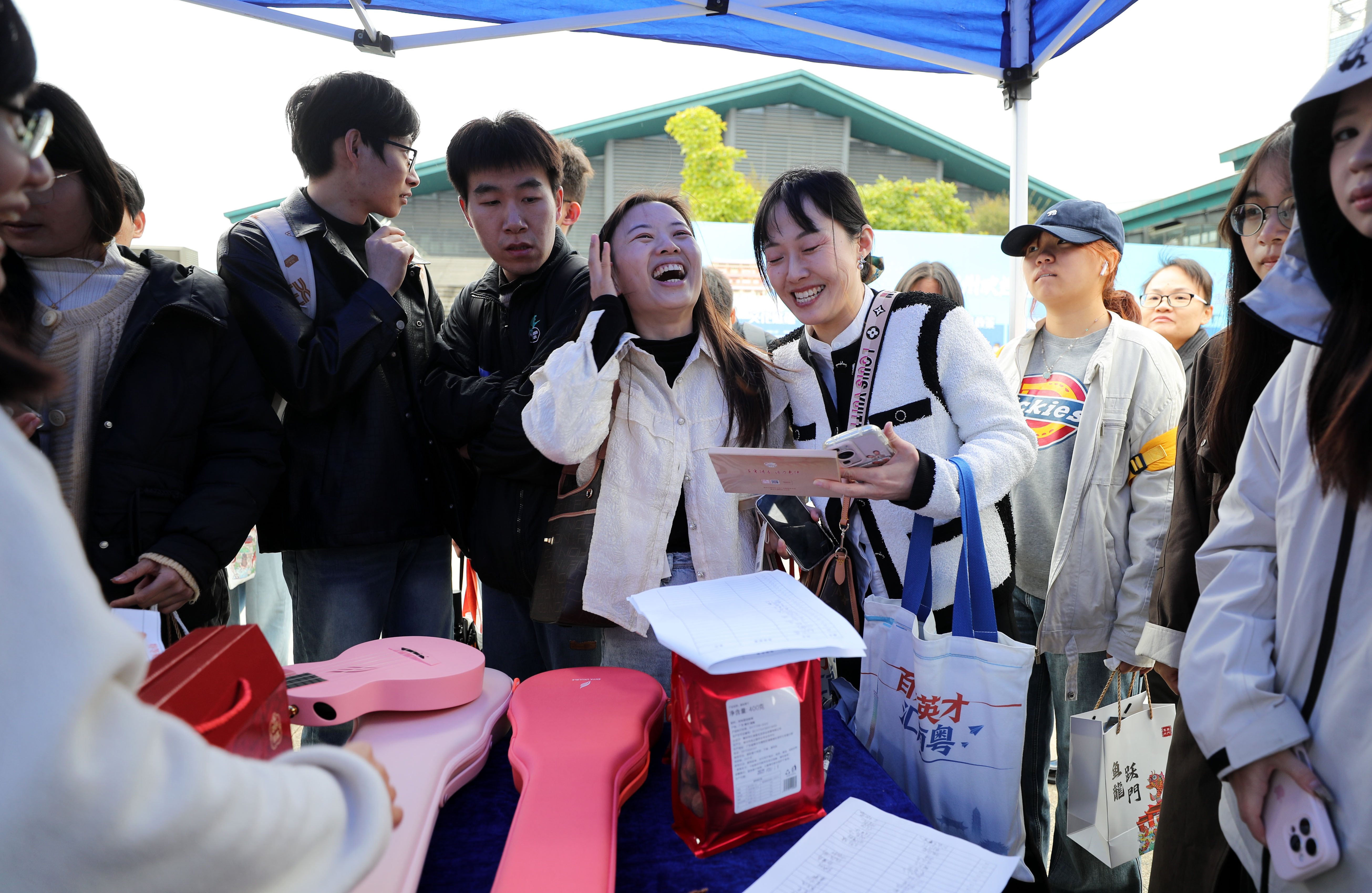 文化体验区:非遗美食、文创体验、抽奖游戏搭配乐队演出,氛围轻松热闹;“城市礼遇包”内含十五运会特许商品与文旅门票,让学子在求职间隙沉浸式感受岭南风韵。