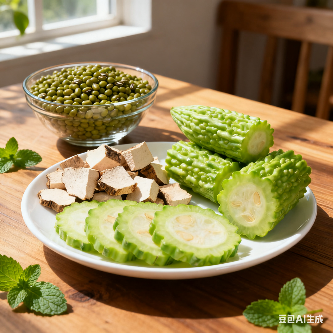 绿豆200g、白扁豆100g、干金银花10g、干蒲公英10g、陈皮1角(4人量)。