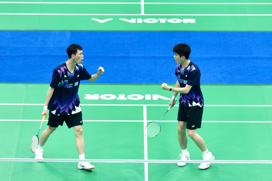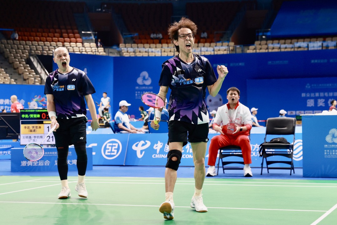 男双D组(55岁-64岁)的王明基/李钧照与男双B组(35岁-44岁)颜静熙/邢福星挺进今天上午举行的决赛。王明基/李钧照以2比0击败福建队组合李昆/贾雪涛,先拔头筹。男双D组是上午六个双打决赛中最早结束,因此广东队也夺得了本届全运会群众羽毛球首金。在男双B组(35岁-44岁)项目,广东队的颜静熙/邢福星收获一枚银牌。