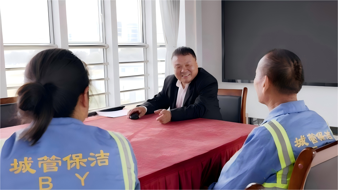 尹勉才(中)与同事交流环卫工作