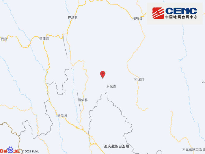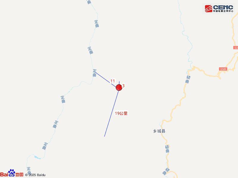 震中距乡城县22公里、距得荣县54公里、距稻城县63公里、距云南德钦县99公里、距巴塘县116公里,距云南迪庆藏族自治州140公里,距甘孜藏族自治州249公里,距成都市462公里。