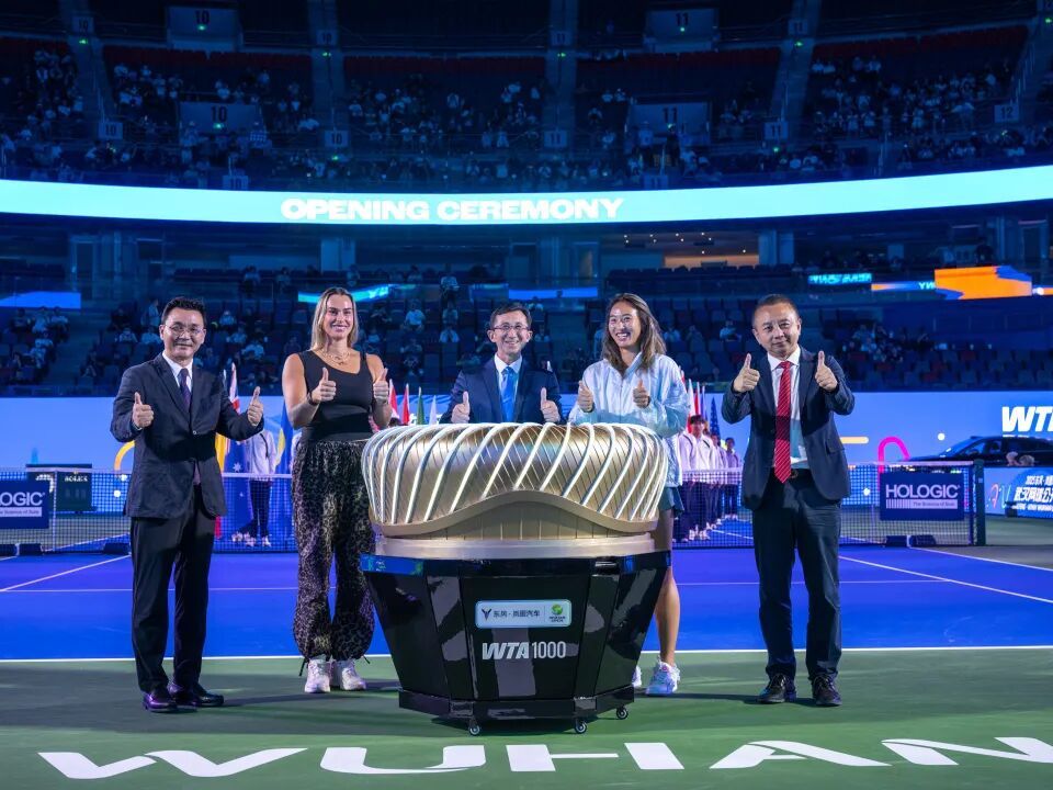 10月6日,白俄罗斯选手萨巴伦卡(左二)、中国女子网球选手郑钦文(右二)等在开幕仪式上。当日,2025年WTA武汉网球公开赛开幕仪式在武汉光谷国际网球中心举行。新华社记者 肖艺九 摄