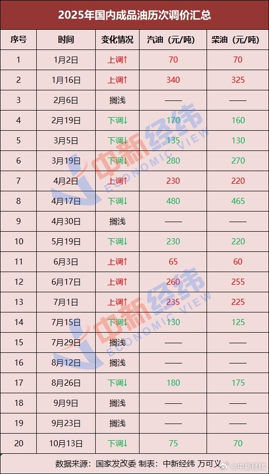 国内成品油新一轮调价窗口将于10月27日24时开启。综合机构观点,本次调价或将出现年内第九次下调。据金联创测算,截至10月24日第九个工作日,参考原油品种均价为60.44美元/桶,变化率为-6.22%,对应的国内汽柴油零售价应下调290元/吨。汽柴油零售价年内第9次下调即将如期兑现。照目前幅度计算,本次汽柴油每升或下调0.22-0.24元左右,广大车主用油成本将进一步减少。其中,汽油方面,按油箱容积为50升的小型车计算,加满一箱油将减少11.5元左右的开支。