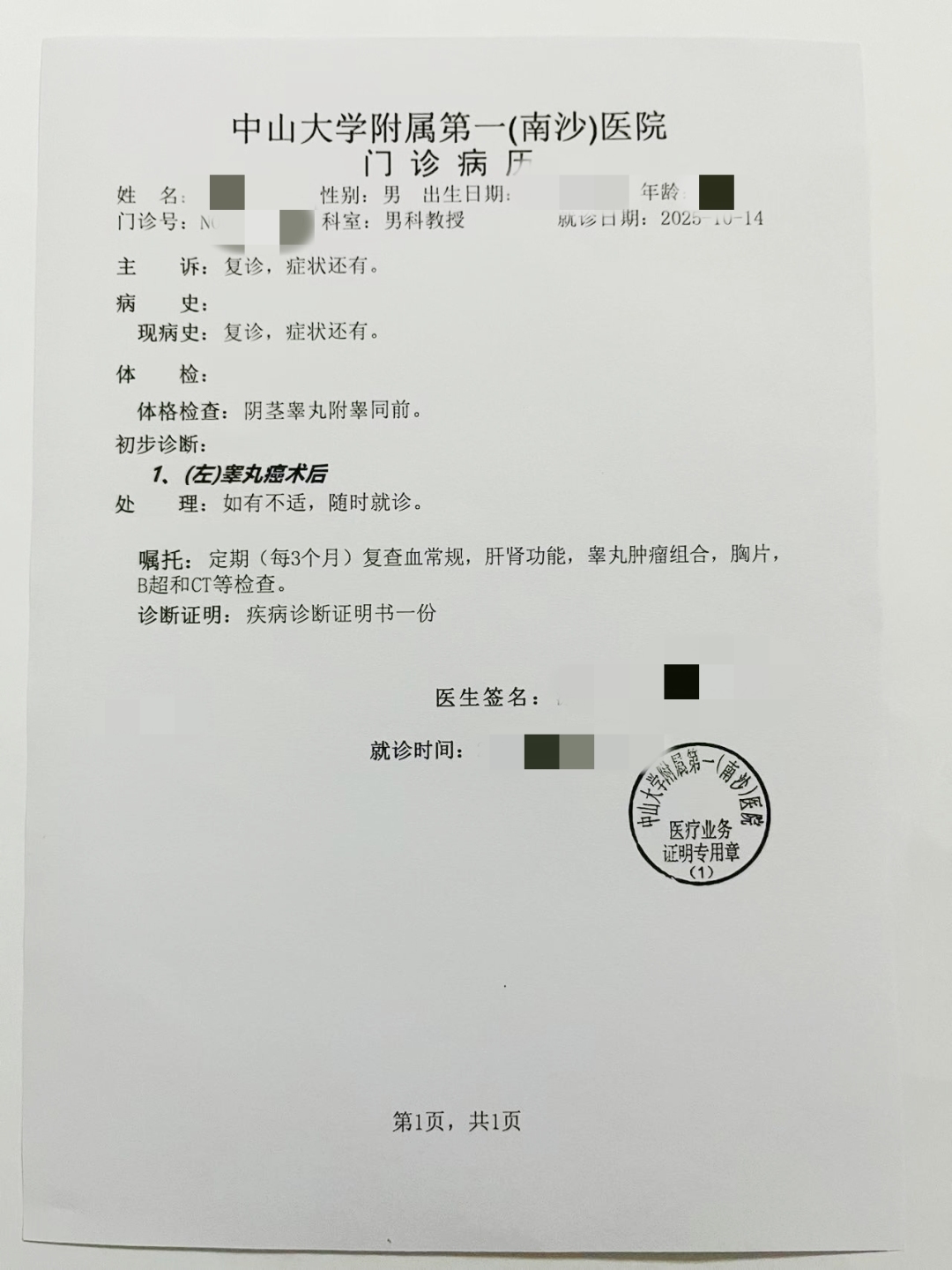随后,刘先生也向记者透露的最新进展,他从原来的中山大学附属第一(南沙)医院,转到中山大学附属第一医院进行治疗,“第一次复查结果有发现淋巴结,目前未确定是不是复发,建议两个月后再复查。因没化疗,所以还是没办到门特。”刘先生说,目前也没有要吃药,支出没那么大,只是一些检查费,大概复查一次总费用是1800多,不算很高,就先不管门特的事了。