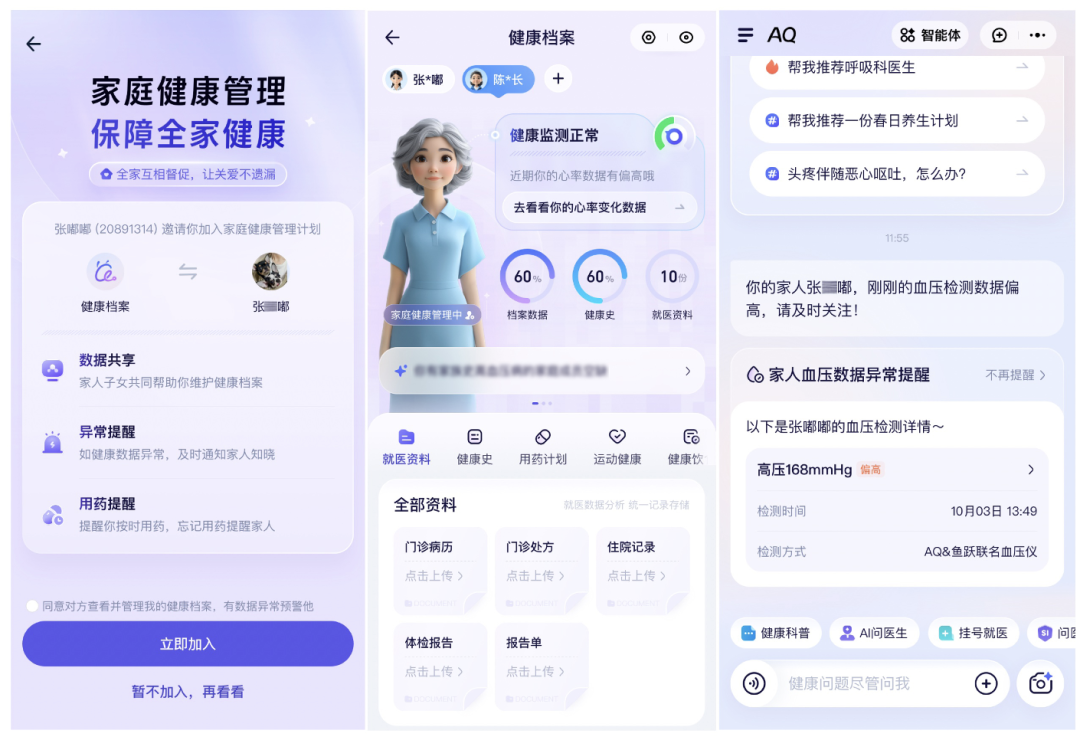记者了解到,围绕老年慢病健康管理,AQ推出了多项功能:拍一拍血压计、血糖仪即可智能解读数据,像医生能追问,并支持健康数据异常的即时预警;与鱼跃联合推出AI血压计,可自动同步数据并生成健康周报,便于血压长期管控;推出慢病用药提醒功能,父母和子女都会定时收到通知,减少忘吃漏吃,避免病情反复;支持健康档案共享给家人,父母的病历和体检报告,子女随时能看、能管、能提醒……通过技术让子女即使身处异地,也能为父母的健康筑起“防护网”。