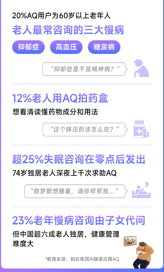 近年来,不少老年人受慢性病困扰。其中,三高症(高血压、高血糖、高血脂)是普遍的健康隐患。据AQ披露,AQ上,60岁以上用户占了近20%;12%的老人会用AQ拍摄药盒,希望看懂药物成分和用法;老人们也会通过语音反复咨询慢病护理知识,从“冠心病注意事项”到“糖尿病饮食指南”……他们既为身体不适担忧,也亟须更多有效的帮助,比如在偶尔漏吃药或忘测血压的时候给予提醒。