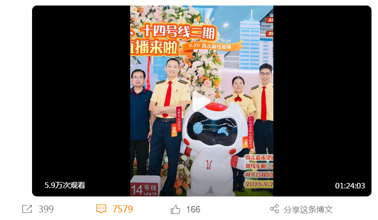 9月29日,“广州地铁”微博号发布帖文,官宣广州地铁新线开通。一是直播活动沉浸式感受新线开通,具有较高关注度。@广州地铁 当天发起新线开通直播活动,累计收获5.9万次观看。二是发起抽奖活动,吸引网民积极参与。@广州地铁 邀请网民带话题#新线来啦#转发博文的抽奖活动,带动话题阅读量达610.1万,该帖文转评赞累计超8千次,网民参与互动热情高涨。三是带动账号影响力提升。新线开通直播、抽奖活动共同带动广州地铁位居本月广州市政务微博传播力第1位、互动力第2位,影响力较上月上升7个名次。