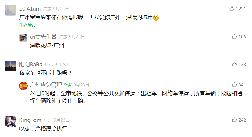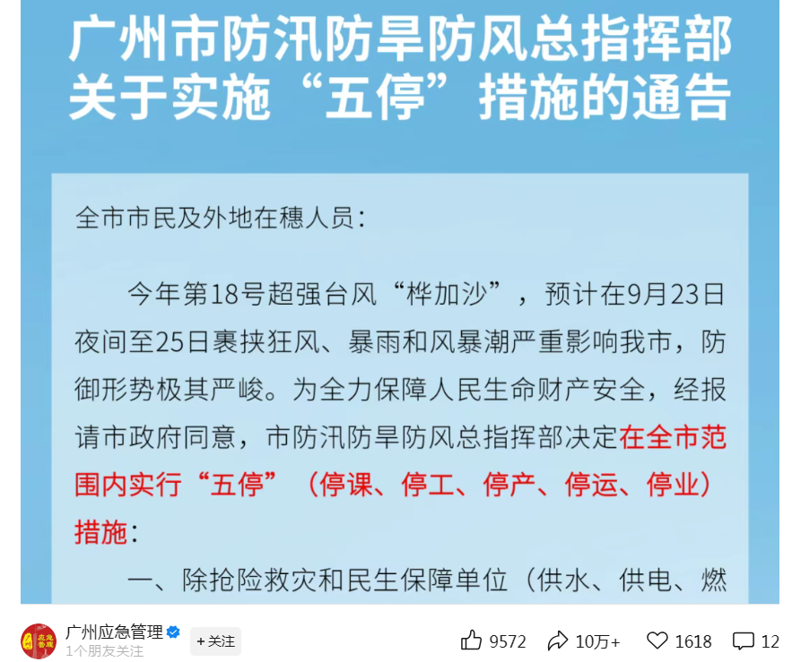 9月23日,微信公众号“广州应急管理”发布文章《定了!广州实施“五停”》,以海报形式发布《广州市防汛防旱防风总指挥部关于实施“五停”措施的通告》。一是突出显示“五停”措施信息,获网民大范围转发。该海报标红显示“五停”措施实施时间、具体措施,突出重要信息。文章一经发布,迅速引发舆论关注,文章阅读量突破10万+,转发量超10万次,点赞量、在看量累计超10万次,辐射效果明显。二是积极回复网民问题,精细化政务服务获肯定。有网民在评论区询问“私家车也不能上路吗”,编辑详尽回复停运、停止上路措施时间、范围。此外,“原来你在做海报呢,温暖的城市”等留言获编辑和网民点赞超两千次,精细化政务服务、良性互动值得肯定。三是市区级政务微信联动,提升“五停”公告传播垂直抵达率。“五停”公告发布后,微信公众号“中国广州发布”“广州海珠发布”“广州荔湾发布”“广州花都发布”“广州黄埔发布”等转发该公告,均收获10万+阅读量,有效提升公告在地传播抵达率。四是实施、终止“五停”措施系列公告带动账号影响力提升。微信公众号“广州应急管理”分别于9月23日、24日发布实施、终止“五停”措施公告,均收获10万+阅读量,直接带动广州应急管理本月位居广州市级政务微信影响力第4位,较上月上升14个名次。
