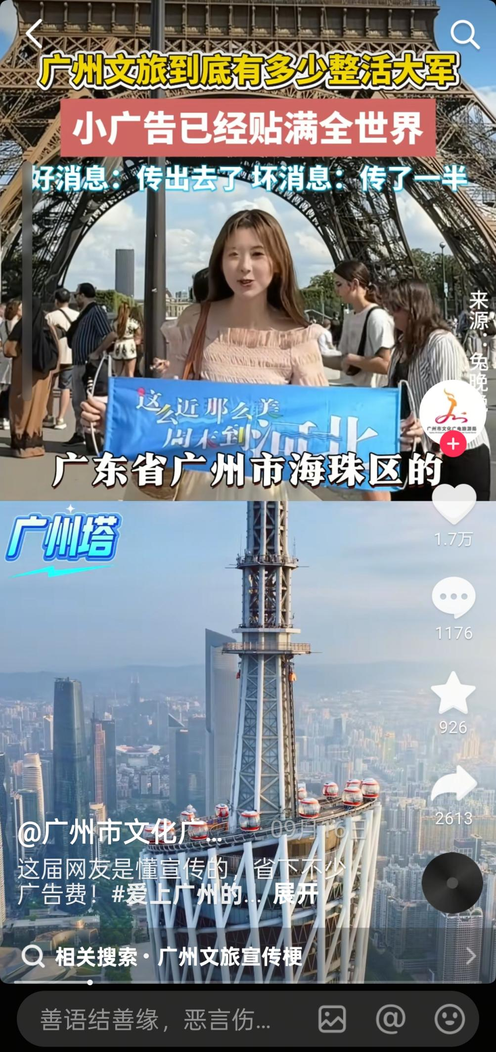 9月16日,“广州市文化广电旅游局”抖音号发布视频《这届网友是懂宣传的,省下不少广告费》,一是文旅官方转发民间创意视频,获赞双向奔赴。该视频截取网民对“活力大湾区 魅力新广州”官方品牌的创意视频、配图广州地标,并称“广州文旅到底有多少整活大军,小广告已经贴满全世界。好消息:传出去了;坏消息:传了一半”,对二创视频进行传播扩散,官方与民间的“双向奔赴”值得肯定。二是官方品牌与民间创意互动,取得良好传播效果。目前,该视频累计收获点赞1.7万,吸引更多网民加入创意宣传行列。如“等我去了维港我就说这是珠江”“广州文旅:在家我从不用宣传,你们出去抢我饭碗是吧”“你的兵遍布全球啊”等留言显示网民对相关视频的肯定和参与热情。三是该视频直接带动账号影响力有较大提升。广州市文化广电旅游局位居本月广州市政务抖音影响力排行榜第5位,较上月上升11个名次。