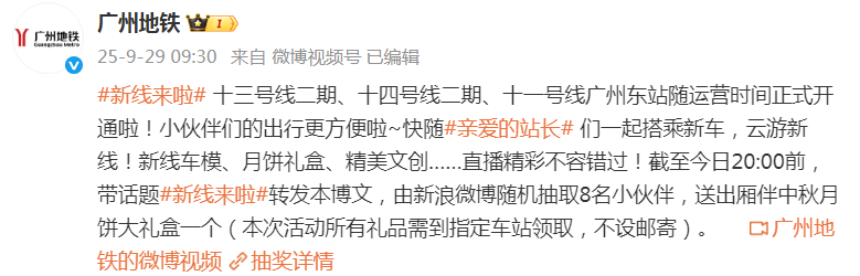 广州地铁:新线开通直播、抽奖活动吸引网民参与,带动账号影响力提升(←点击查看)