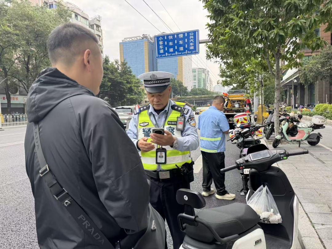 记者留意到,与此前相比,徳坭立交下桥处闯桥隧的电动自行车变少了。在东风西路南侧人行道上停放的数十辆电动自行车中,仅有一辆无牌车,遮挡号牌的情形也较少。“你看这个号牌此前是有被遮挡的,胶痕还在,二维码无法直接识别。对这种情况,我们会手动输入车牌号进行核查。”执勤交警发现该车存在5宗交通违法未及时处理,遂对其进行暂扣。