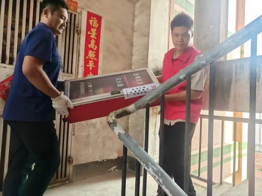 化龙社区“两委”干部和党员志愿者将消防箱搬到各个设置点