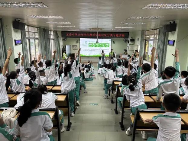 “过期药品属于什么垃圾?”“喝完的饮料瓶应投入哪个垃圾桶?”在互动问答环节,同学们踊跃举手、积极回应,在轻松的氛围中巩固了所学知识。这种互动式、沉浸式的教学方式,不仅激发了学生们的参与热情,也让他们在思考与回答中深化了对垃圾分类意义的理解。