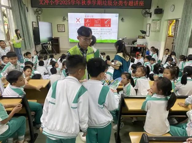 活动现场气氛活跃。宣讲人员借助图文并茂的PPT和生动有趣的动画视频,将垃圾分类知识转化为孩子们易于理解的语言。课程围绕“为何分、怎么分、分去哪”这条主线,系统讲解了垃圾分类的具体方法及后续处理流程,引导学生树立“垃圾分类是保护环境、节约资源的举手之劳”的环保观念。
