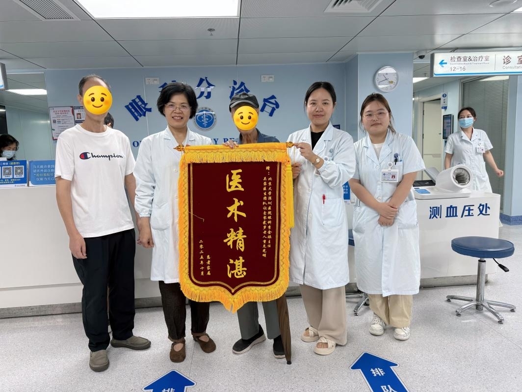 “我现在打麻将也看得清牌,不要再靠瞎摸了,太感谢你们了!”在北京大学深圳医院(以下简称“北大深圳医院”)眼科门诊,102岁的罗爷爷(化名)在家人的陪伴下,满脸激动地向眼科团队送上了写有“医术精湛”字样的锦旗。