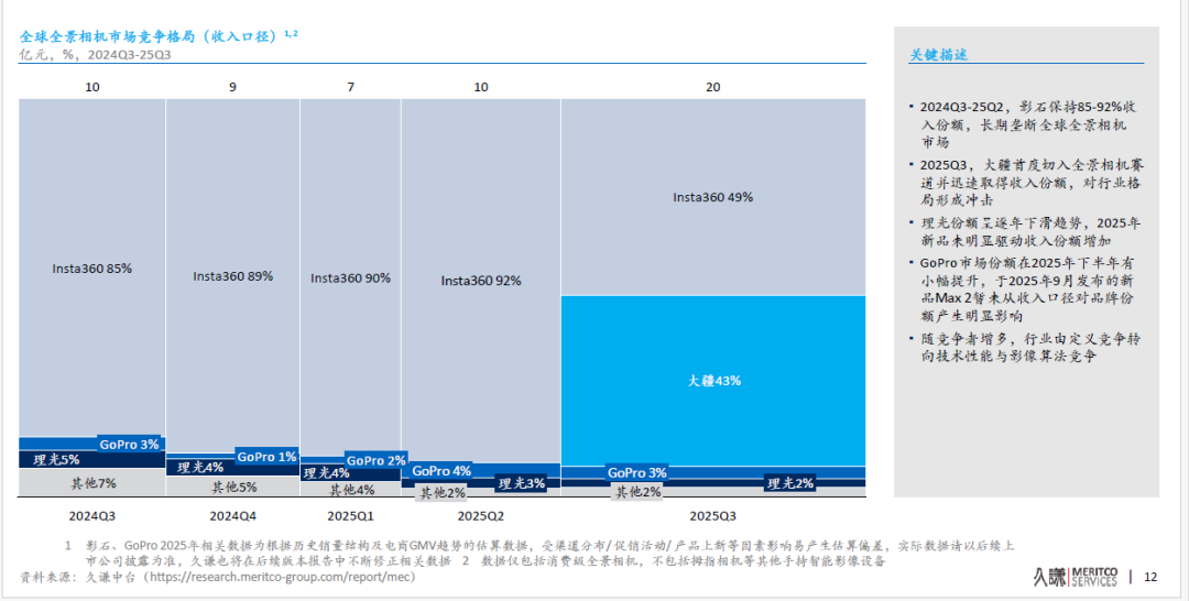 10月27日,权威管理咨询机构久谦咨询发布的全球全景及运动相机市场研究报告显示,全球影像设备市场格局正经历快速调整,具有“后发优势”的中国品牌大疆已实现对两大细分赛道的双重领跑——2025年Q3运动相机全球收入占比达66%,全景相机全球市占率达43%,均以绝对优势改写市场格局。