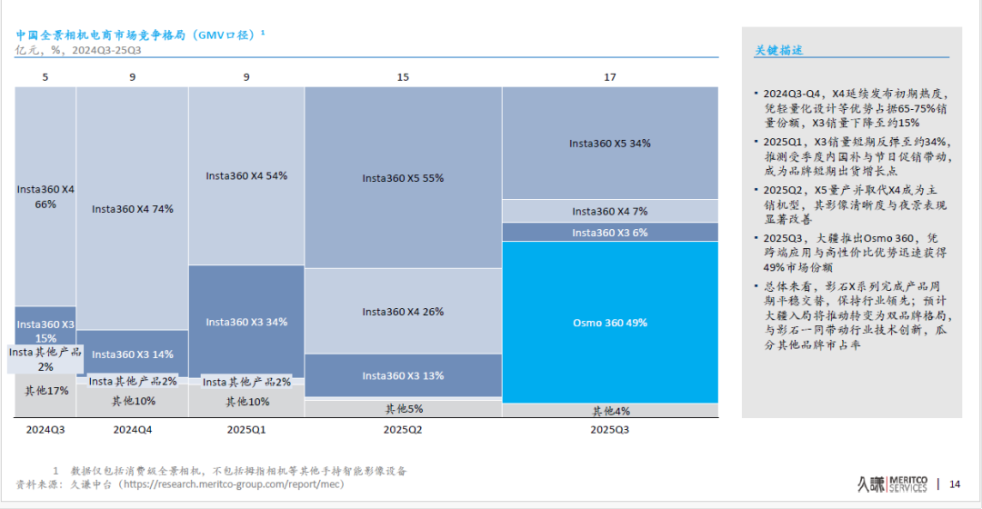全景相机市场的变动更为激烈。大疆于今年7月31日才正式入局该领域,其首款全景相机Osmo 360凭借跨端应用与高性价比优势,在不到三个月内便实现市场突破:中国电商渠道份额达49%,全球市场份额攀升至43%。在京东“户外全景运动相机热卖榜”中,这款新品发布不足三月即登顶,且已连续占据榜首位置 49天,加速推动全球全景相机市场重构。
