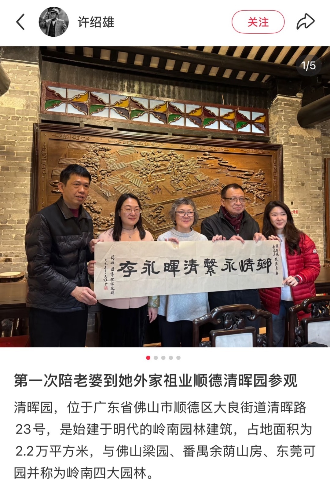 2025年3月,许绍雄在社交媒体上晒出了与女儿在清晖园的合影