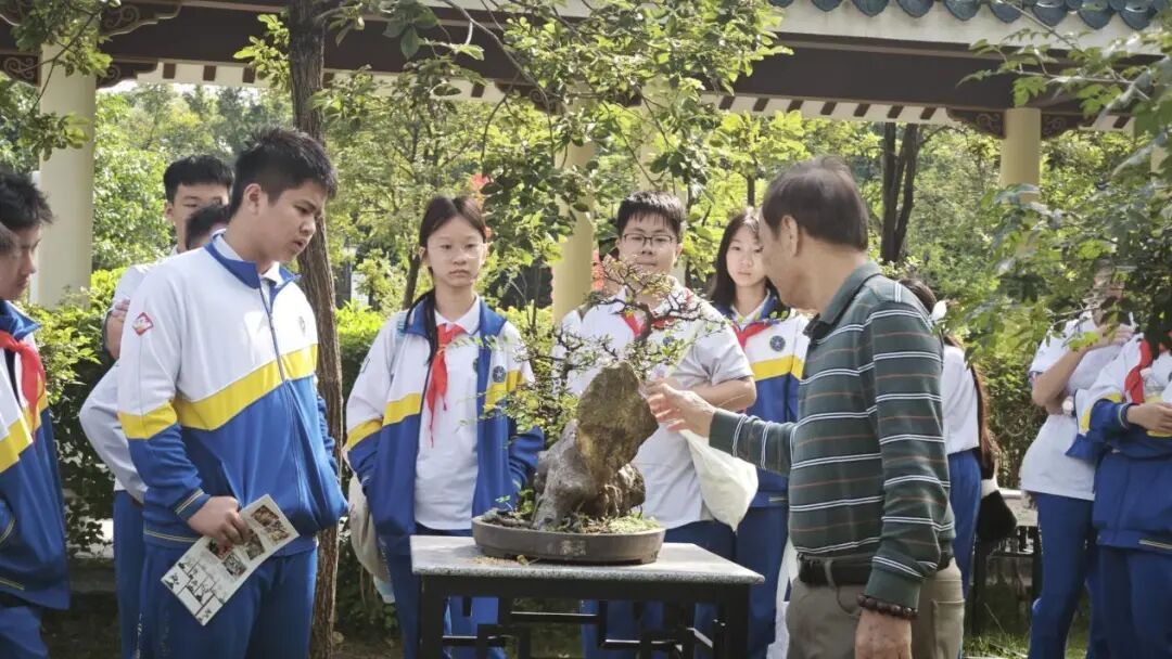 理论学习过后,课程步入“实地鉴赏”环节。导师带领学生们前往增埗公园中的岭南盆景生态园,让大家近距离触摸、观察真实的岭南盆景作品。园中的盆景或虬枝盘曲,或疏朗有致,每一盆都藏着匠心。导师围绕园内经典盆景,逐一讲解其造型设计逻辑、多年养护历程,甚至俯身示范如何观察盆景的生长状态,学生们纷纷驻足,有的拿出笔记本记录要点,有的围着盆景轻声交流。“原来这棵盆景已经有几十年树龄了”“这样的造型要修剪好多次吧”,在沉浸式观察中,将课堂上的理论知识与实际作品深度结合,真正做到“学以致用”。
