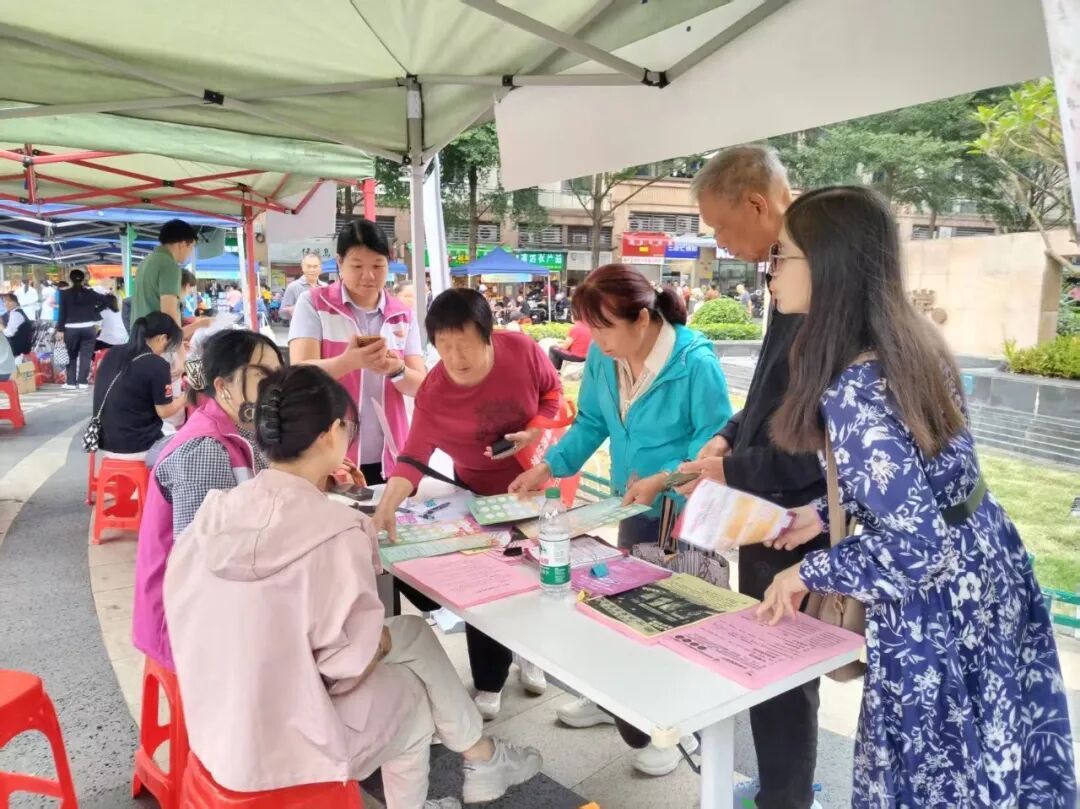 在摊位活动区,“打卡集章兑礼品”的模式深受老年人喜爱。活动宣布开始时,长者居民朋友们陆续在签到处领取打卡本,随后前往各个摊位参加义诊、进行健康咨询、了解养老政策、咨询养老服务、体验不同养老产品等,每完成一个摊位的互动,就能获得一枚印花章。