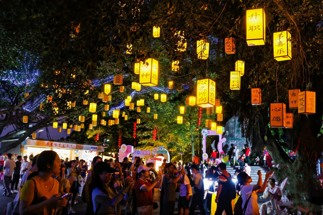 今年重阳,摩星岭园中园祈福灯已全面升级,只需扫码,就能为家人、朋友点亮专属祈愿灯,让灯光承载健康、平安、美满的祝福,传递心意。现场不少市民在参与活动。