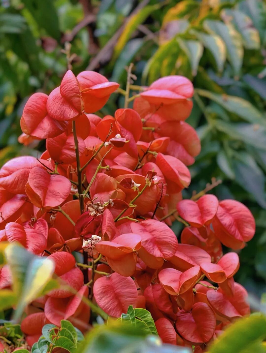 栾树从10月中下旬进入结果期,果实呈鲜红色,形似小灯笼,与绿叶、黄花形成色彩层次丰富的秋日景象。阳光照射下,果实闪烁着灼灼光芒,营造出“一半夏日、一半秋日”的独特氛围。