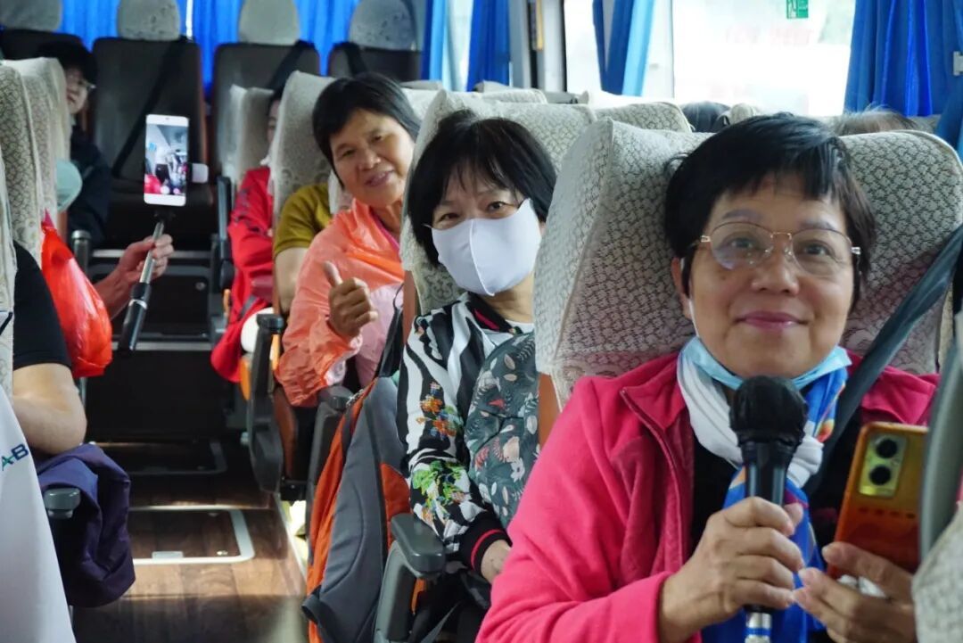 清晨8点半,大巴准时从钟村街出发。在工作人员的带动下,车厢内歌声飞扬。《歌唱祖国》《搀扶》《想念妈妈》等经典旋律接连响起,几位“歌神”轮番登场,后排的长者们也随着节拍加入合唱。原本一个多小时的车程,在欢声笑语中悄然度过。