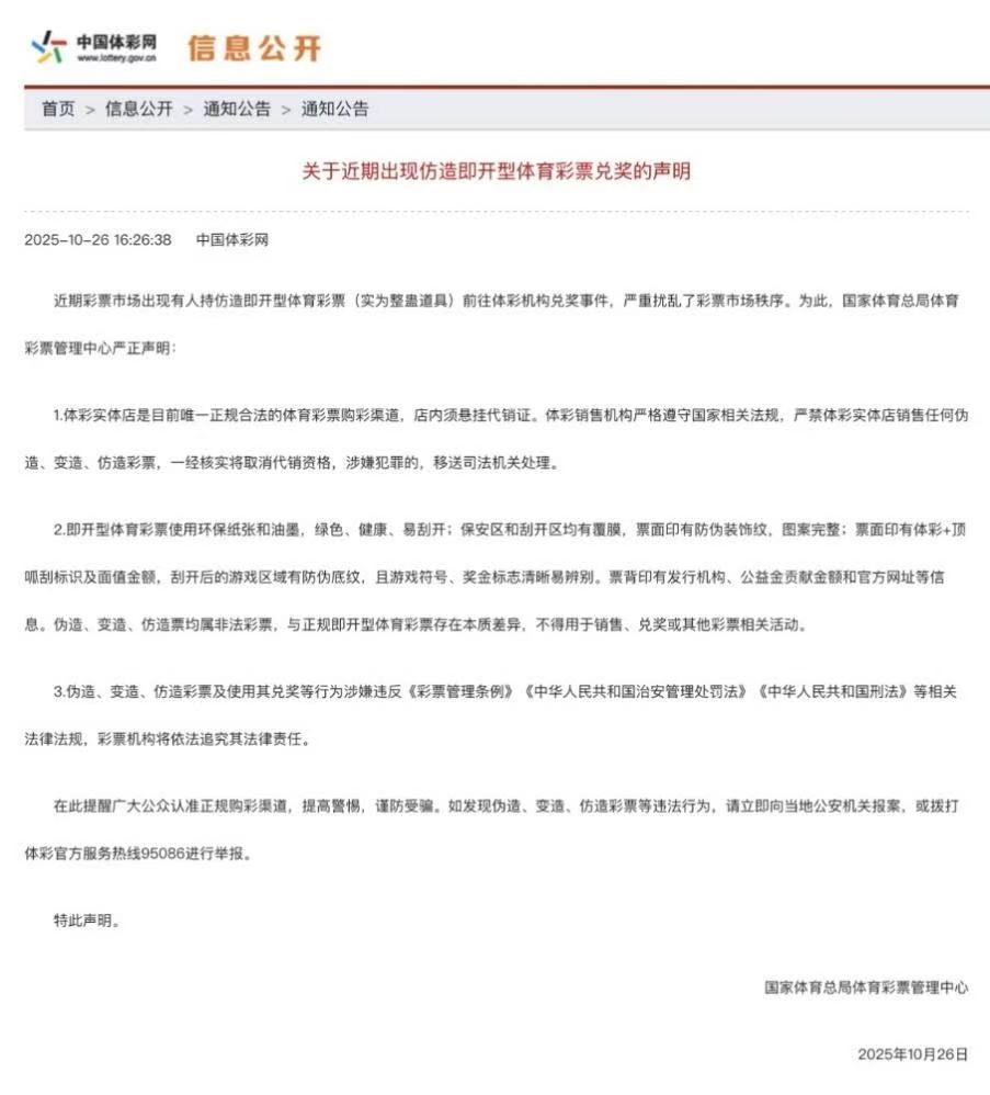 10月28日,央视《朝闻天下》栏目报道了一则关乎每位购彩者切身利益的重要新闻——国家体彩中心正式发布了《关于近期出现仿造即开型体育彩票兑奖的声明》,揭示了近期彩票市场上有不法分子利用仿造的即开型体育彩票(实为整蛊道具)试图在体彩机构进行兑奖,此举不仅严重扰乱了正常的彩票市场秩序,也对广大购彩者的权益构成了潜在威胁。