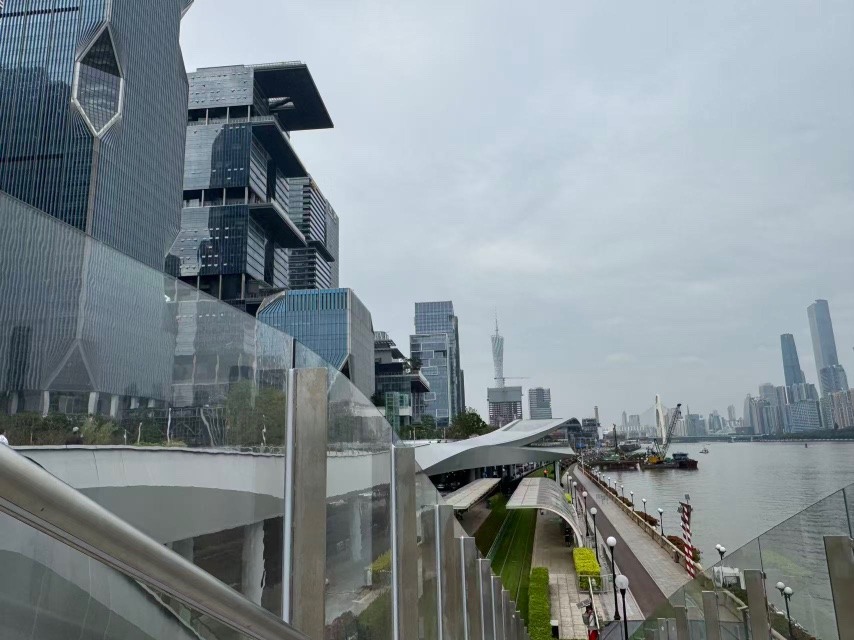 项目在临近珠江位置特别设计了亲水观景平台,平台上方,有一弯最大跨度达66米的钢结构穹顶,两者结合共同构成了“珠江之吻”。穹顶主要由钢管结构与交叉网格铝合金结构组成,以两端的钢柱与钢斜撑为支撑点,中间拱形弯曲的网状透光穹顶无任何钢柱支撑,安装极为困难。项目团队对穹顶进行全面的受力分析,采用合理分段、控制安装顺序、设置临时支撑的方法安装,在工厂利用激光三维扫描仪完成模拟预拼装,在现场使用高精度的全站仪控制钢构件的相贯线接口,使横向撑杆与主梁、斜撑与主梁的连接节点保持精密对接,确保“珠江之吻”结构稳定、形状优美。