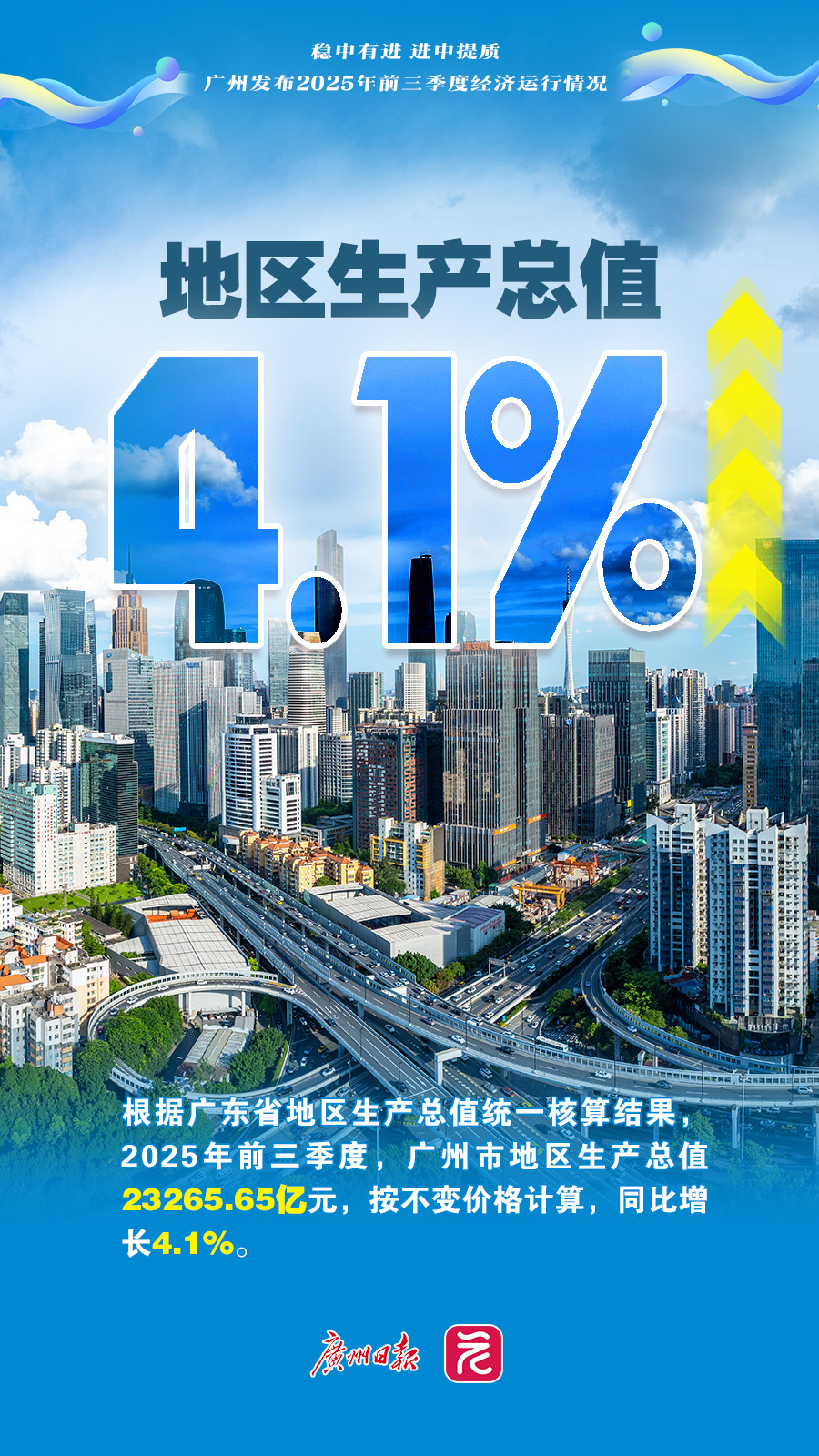 【同比增长4.1%!组图带你看广州今年前三季度经济运行表现→】10月30日,广州市统计局公布2025年前三季度经济运行情况。根据广东省地区生产总值统一核算结果,2025年前三季度,广州市地区生产总值23265.65亿元,按不变价格计算,同比增长4.1%。详情>>>【解码广州经济三季报,看懂高质量发展“新底色”】详情>>>