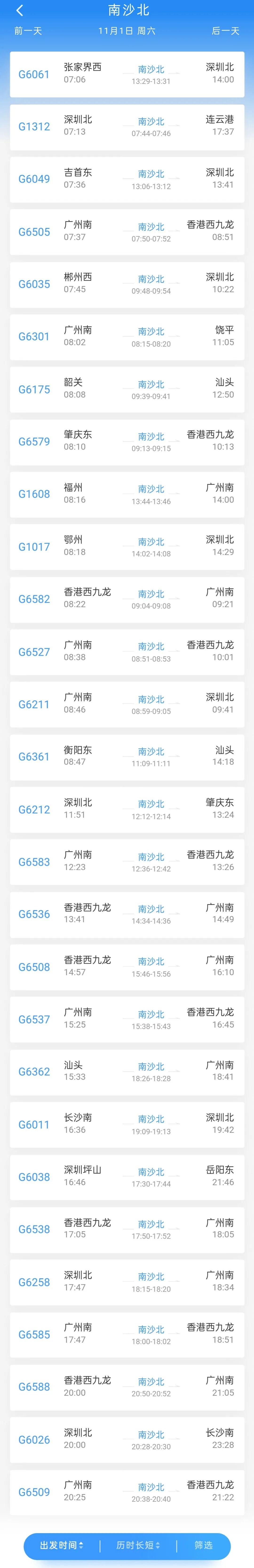 根据12306最新发布的列车时刻表,从11月1日起,南沙北站停靠车次大幅增加,全天日常发送车次达到28个班次,11月2日则有29个班次,通往广州南、香港西九龙以及深圳等核心地区的线路班次密、时间广,基本实现“随到随走”的公交化运营。