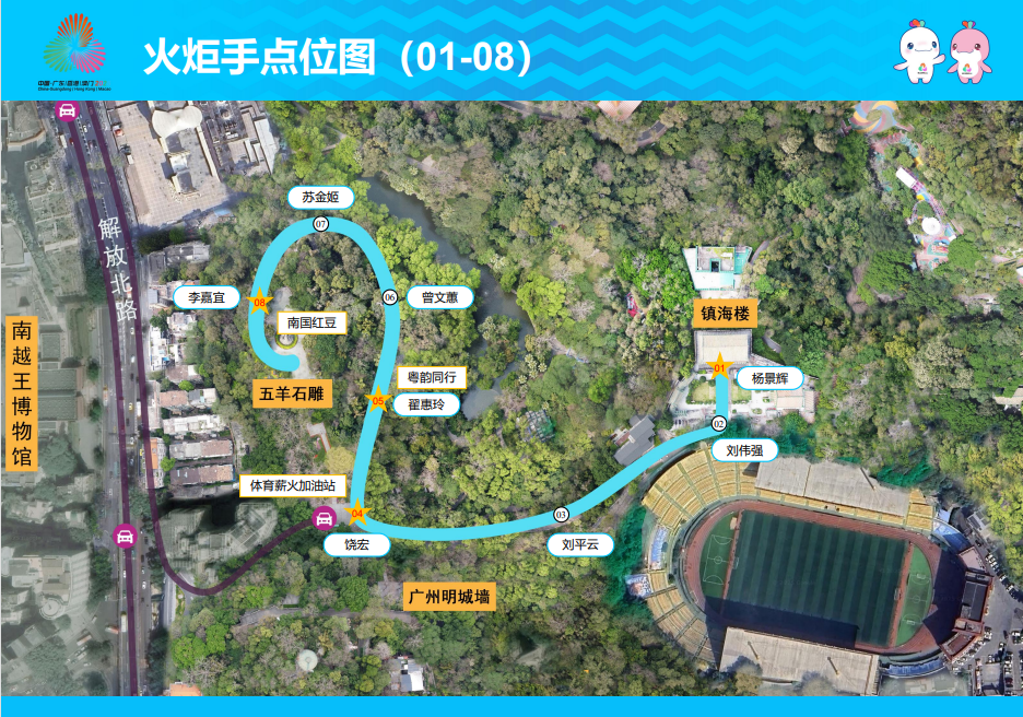 起跑段(跑动传递0.6公里):镇海楼(起跑仪式)—观音山战斗遗址—明代古城墙—五羊仙庭—五羊石像。