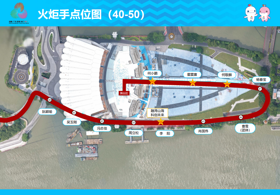收火段(跑动传递4.2公里):广东体育馆—星海音乐厅—广东美术馆—二沙岛体育公园—宏城公园—艺术公园—海心桥—海心沙亚运公园—星光大道—海心沙中心舞台(收火仪式)。