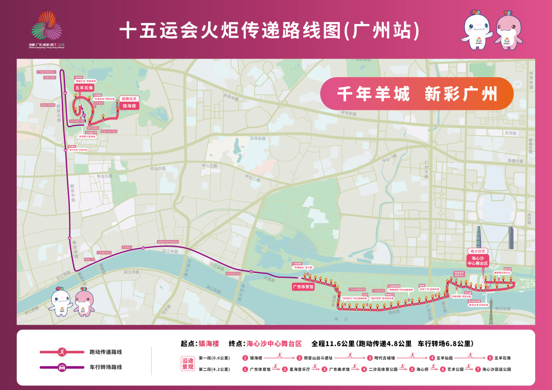 十五运会火炬传递广州站整个火炬传递路线共11.6公里,其中跑动传递4.8公里,无人驾驶车辆转场6.8公里。